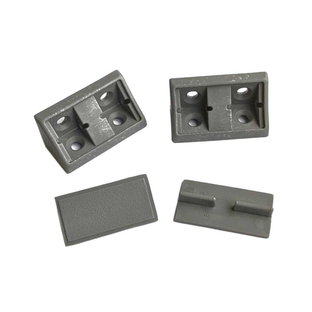 Double corner joint with lid designed to hide mounting screws. This joint is constructed from grey polypropylene.