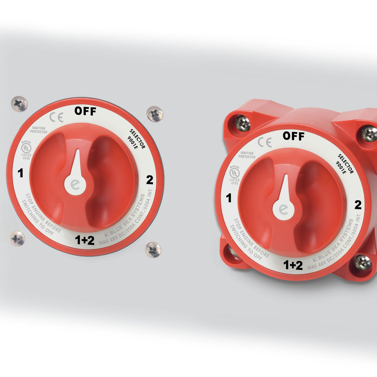 E-SERIES BATTERY SWITCHES 350 Ampere continuous rating for inboard gasoline and diesel engines. Tin-plated copper studs for maximum conductivity and corrosion resistance Studs accept 3/8" (M10) ring terminals 7/8" (22mm) stud length accepts multiple cable terminals One-piece terminal stud design never loosens over time Case design allows surface or rear panel mounting options Label with international legends Tactile indicator conveys knob position by feel Specifications: Terminal Stud Size: 3/8" 16 (M10) Terminal Stud Torque: 140 in-lbs Mounting Holes: Accepts M6 screw Cable Size to Meet Ratings: 4/0 AWG (95mm2) Cable Clearance: 1.10" (28mm)