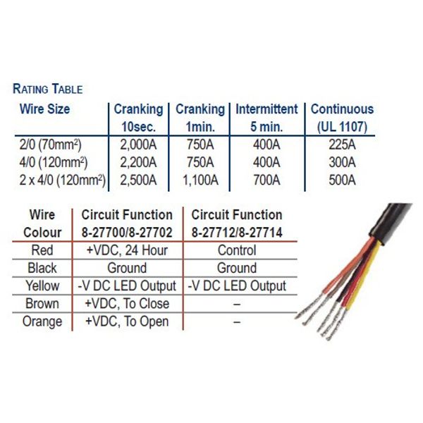 500 Ampere Bi-Stable Magnetic Latching Solenoid allows high-amp switching under load where manual control is not required. 500 Amp continuous rating Bi-Stable Magnetic Latch (ML) - draws no current in the ON or OFF state 3/ 8"-16 tin-plated copper studs for maximum conductivity and corrosion resistance 7/ 8" (22mm) stud length accepts multiple cable terminals Label recesses for circuit identification Silver alloy contacts provide high reliability for switching live loads Retail packaging includes Remote Control Contura Switch Manual control switch provides an added level of safety allowing control with or without power, and offering LOCK OFF capability for servicing. Auto releasing provides 500A switching and features of current ML Remote Battery Switches, but can be controlled with SPST or SPDT switch for applications where a normally open relay is desired. Specifications: Control Circuit Voltage: 9-16V DC Control Circuit Connection: Tinned wires - provided on retail units Manual Control: Yes Coil Function: Bi-Stable Mounting: #10 Amperage Operating Current: 0mA (@ 25C nominal VDC) Amperage Operating Current when changing state: <7A (40 ms) Terminal Stud Torque: 140 in-lb (15.82 Nm) Cable Size to Meet Ratings: 2x (4/0) Live Current Switching: 300A @ 12V DC Master Control Switch Capability: No Mechanical Endurance: 100,000 Cycles Terminal Ring Diameter Clearance: 29.97mm (1.18") Terminal Stud Length: 22.23mm (0.875") Terminal Stud Size: 3/8" - 16 (M10)