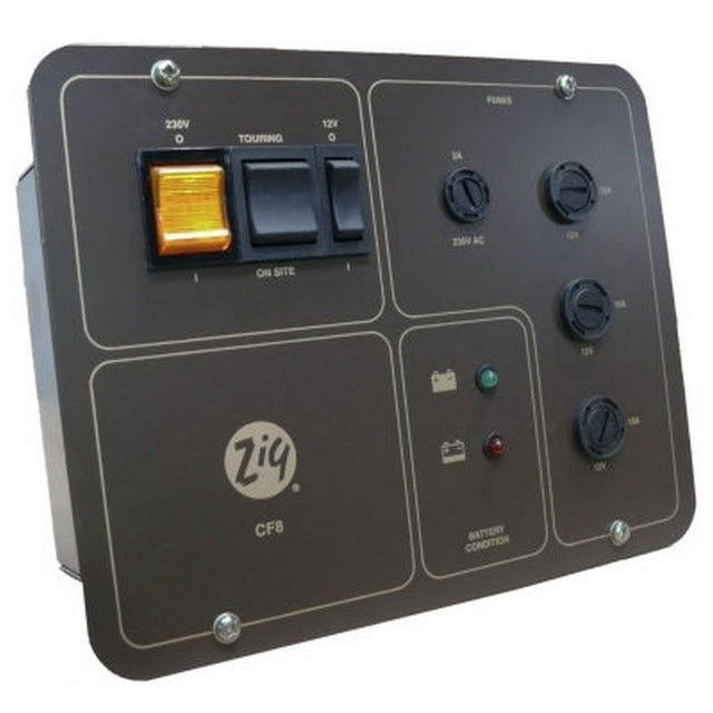 This unit offers battery charging and 230-12V conversion with a battery, up to 4.5A continuously. Features Include: Three 10amp switched and fused outlets for the vehicle's accessories. Dimensions: 206mm (W) x 162mm (H) x110mm (D).