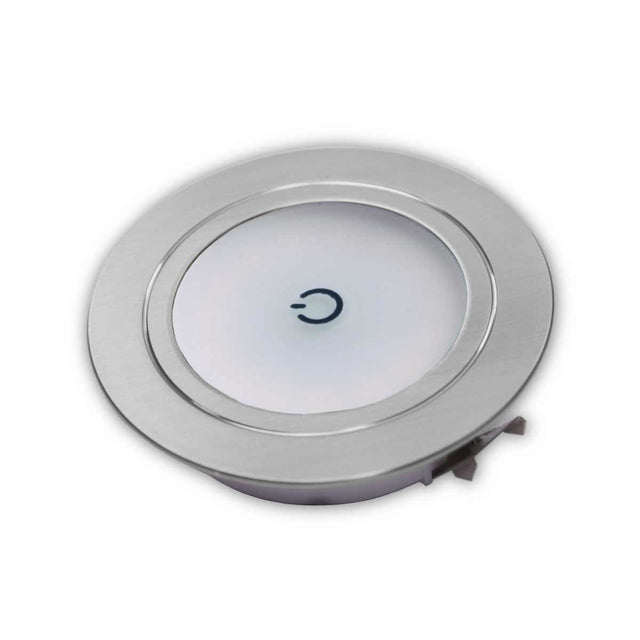 A touch operated downlight with a milky glass lens and brushed aluminium bezel. The downlight is 68mm diameter and fits cut out of 52mm. This product has a protection rating of IP20 and emits a Warm White (3200K) colour temperature. - Voltage: 12V - Wattage: 1.69W - Protection rating: IP20 - Colour temperature: Warm White (3200K) - Lumens: 102 - Switched: No - Touch operation: Yes - Dimmable: No