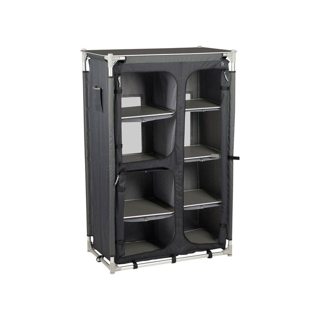 A compact dresser with an optional hanging part. This cabinet has 8 sturdy shelves or 4 shelves on the left and a rod on the right. Has a luxury 2 tone 600 denier polyester cover and a supporting tray. The adjustable legs are separately adjustable so the closet is stable on almost any surface. Comes in a carry bag. Folded up (lxwxh): 94x53.5x15 cm.