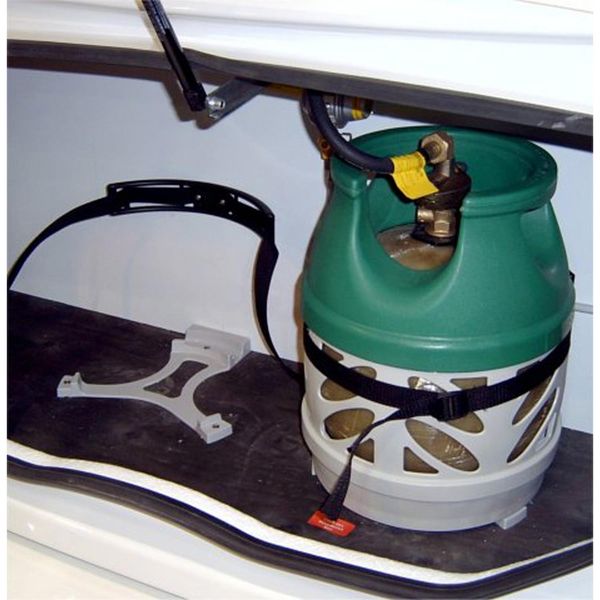 This gas bottle base holder is suitable for BP & Calor gas cannisters. A 6kg or 7kg Calor gas bottle sits inside the top recess and the 2 inner recesses. For a FLO GAS gas light bottle, position the cannister inside the top recess and the 2 outside recesses. The gas bottle base holder is made of ABS plastic.