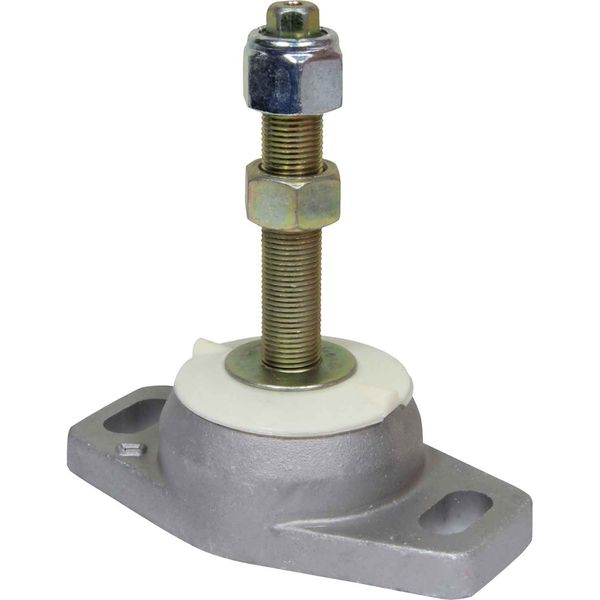 FLEXIBLE ENGINE MOUNTINGS o Capacity 30 - 2000 lbs per mount o Good vibration isolation o Fail safe design o Will withstand roll over test o Competitively priced o Wide range of sizes o Accepts propeller thrust o Pre-loaded o Slotted holes to assist alignment o Height adjusting to simplify alignment INSTALLATION DETAILS Maximum clearance between the underside of the height adjusting nut and top washer must not be more than 10mm. If more height is required use a spacer under the mounting casting. This applies to all mountings in the R & D Marine Range. HOW TO SELECT 1. Engine type, number of cylinders 2. Type of gearbox and reduction ratio 3. Weight of engine and gearbox combined by weighing or manufacturers literature 4. Is flywheel in conventional place between the engine and gearbox? 5. Position of engine mounting points 6. Find centre of gravity by balancing on a roller, if possible, (see above diagram) 7. If centre of gravity cannot be found, assume weight distribution of 60% on rear mounts, with 40% on front mounts (if rear mount is in line with the flywheel) COMPRESSION MOUNTING Competitive, low height medium capacity mount giving good engine control. 5/8 Stud. Deflection: 1.65mm (0.065") Height adjusting nut thickness: 14mm (0.55")