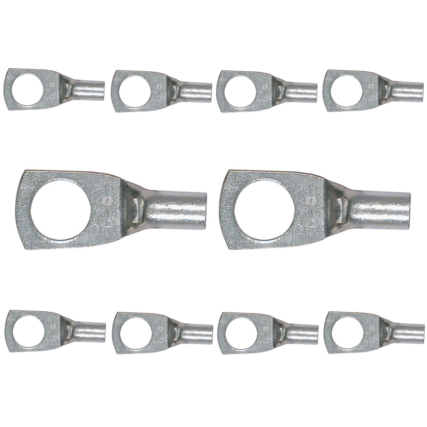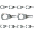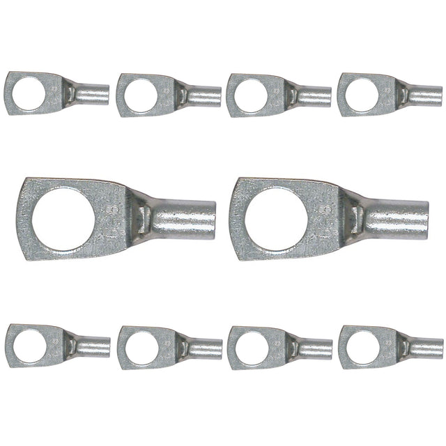 A pack of 10 battery cable terminal eyes constructed from tinned copper, part of the Auto Marine range. These terminals use an eye fixing to secure to battery studs and a cable entry suitable for crimping or soldering. Features an inspection hole at the front of the terminal.