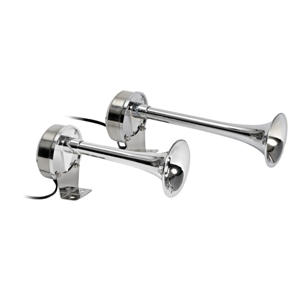 Twin polished stainless steel and chromed ABS horns 12V two tone.