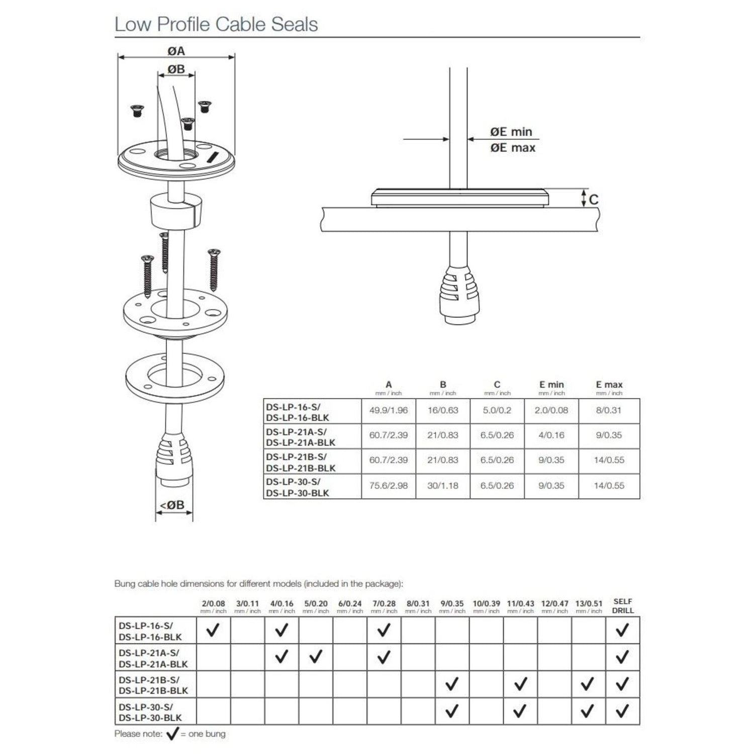 Scanstrut's DS-LP-30-S Low-Profile Cable Seal is engineered to effortlessly accommodate cables ranging from 9-14mm (0.35"-0.55"), connectors up to Ø30mm (1.18"), ensuring a seamless and impact-resistant solution.