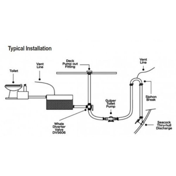 For holding tank electric pump out/discharge. No clog, no filter waste pump built on more than a decade of market leading pump technology Pumps un-macerated toilet waste Features and Benefits o Pumps un-macerated toilet waste o Runs dry without damage o Up to 18 litres (4.75 US gal) per minute o Virtually unblockable o Rotatable inlet and outlet - allows you to install in awkward locations o Self priming up to 3m (9.8 ft) - mount the pump in the most convenient part of boat o Pumps a mixture of air and waste o Easy to maintain o Ideal for holding tanks and vacuum systems o Extra large ports 1.1/2" (38mm) for consistent flow o Easy release clamp ring to rotate pump head o High spec protected motor o Head rotates 360 degrees to best suit your installation o Non choke valves to pump unmacerated waste - no moving parts to clog o Rubber mounting feet absorb vibration Accreditations: o Ignition protection ISO8846 o CE marked Specifications: Model: Gulper Toilet Pump Weight: 2.12kg (4.75 lbs) Hose Connections: 38mm (1.1/2") Minimum Wire Size: 1.5mm? (16 AWG) Materials: Pump Body: Aluminium, Glass-filled Nylon, Clamp Ring: Acetal Diaphragm: Santoprene, Valves: Nitrile, Gearwheel: Bronze, Feet: EPDM Fasteners: Stainless Steel, Brass Service Kits: W-AK1557 - service kit Materials in contact with fluid: Glass-filled Nylon, Santoprene, Nitrile Maximum Suction Lift: 3m (10 ft) Maximum Discharge Head: 3m (10 ft) Lift/Head Combined: 3m (10 ft) Tip: Ideal for use in conjunction with Whale's robust and durable Diverter Valve 1/2" ports Part No. W-DV5606