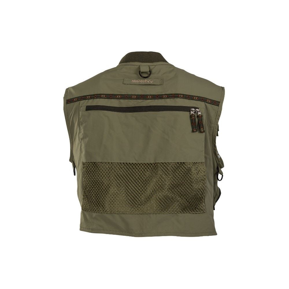 There are two concealed coil retractors on front of vest, for snips, forceps and the 4 main front pockets are a box-design to swallow the largest of fly boxes. There are 5 additional front accessory pockets for floatants, sinkants, leaders etc. Inside are further zipped and mesh pockets and an internal priest pocket. On the rear of the vest is a large bellows pocket, with a further, outer mesh pocket. These have a full length zip one side for large items and a short zip on the left hand side allows a water bottle or spare spool to be easily retrieved, without taking the vest off.
