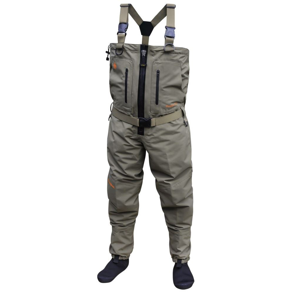 The top of the range stockingfoot model featuring a zip front design. These stockingfoot model features 4mm 3 panel neoprene socks using a new cutting design making them the best fitting most comfortable waders ever. In addition to the high-density sole panel which prevents heel compression leaks this cutting-style tapers the ankles to remove excess material which can otherwise crease up inside wading boots. The 3-panel design ensures all the seams run around and not under the feet for a more moulded fit and added comfort. The integral gravel guards have front lacing hooks and rubberised elastication around the bottm to prevent them riding up when walking.