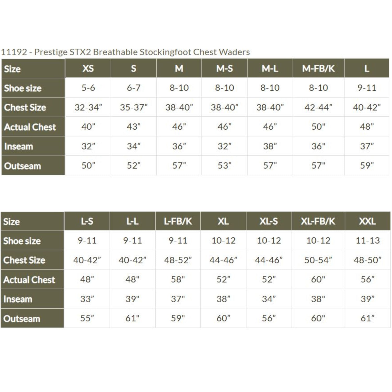 11192 - Prestige STX2 Breathable Stockingfoot Chest Waders Size Charts