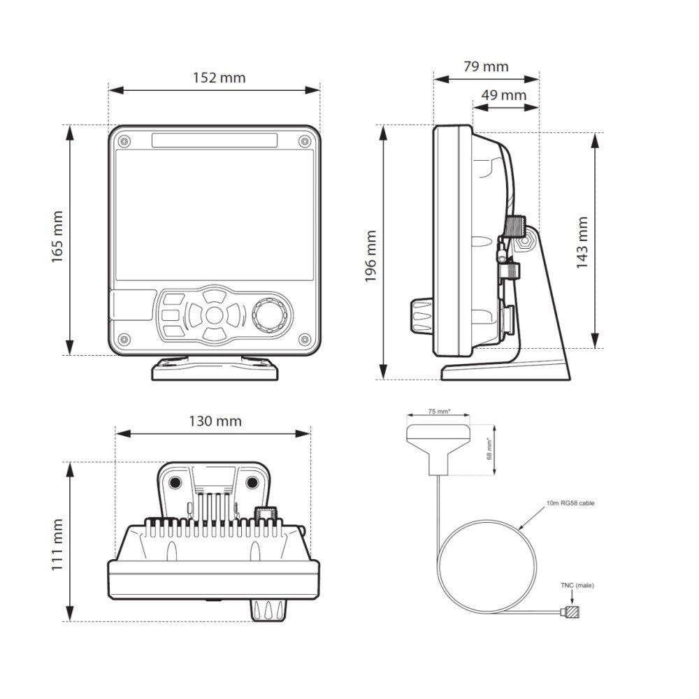 • Integrated GPS with external antenna (supplied) or utilise external NMEA feed (user selectable)