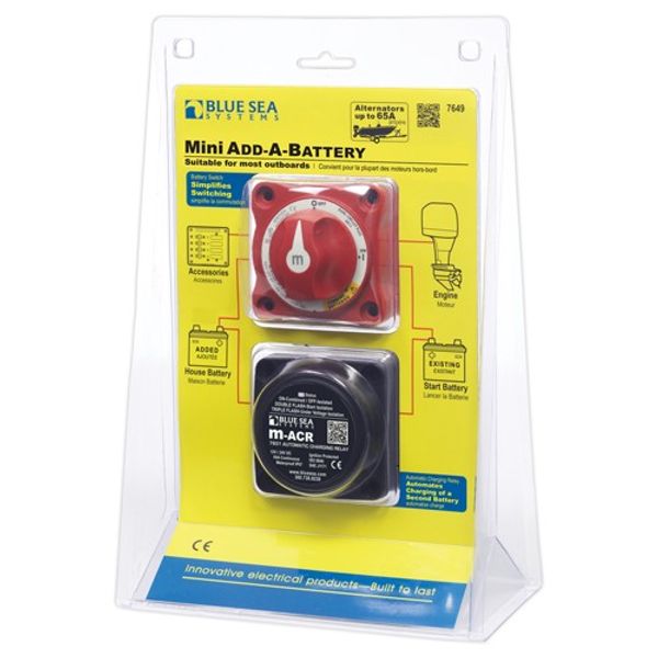 These include a Dual Circuit Plus�Ѣ Battery Switch and an Automatic Charging Relay simplifying switching & automate charging, so that you just turn the battery switch ON when you board and OFF when you leave. Adding a second battery prevents getting stranded with a dead battery by isolating the start battery from the house loads that can quickly discharge a battery. The Add-A-Battery offers a simple way to control switching with the Dual Circuit Plus�Ѣ Battery Switch and automatically share a single source of charging between two batteries with the ACR. The Dual Circuit Plus�Ѣ Battery Switch Simplifies battery switching Isolates engine and house circuits Switch combines battery banks for emergency starting Automatic Charging Relay (with optional start isolation) Automatically combines battery banks during charging Isolates battery banks when discharging and when starting engines Battery: Switch m-Series 8-26011 ACR: m-ACR 8-27601