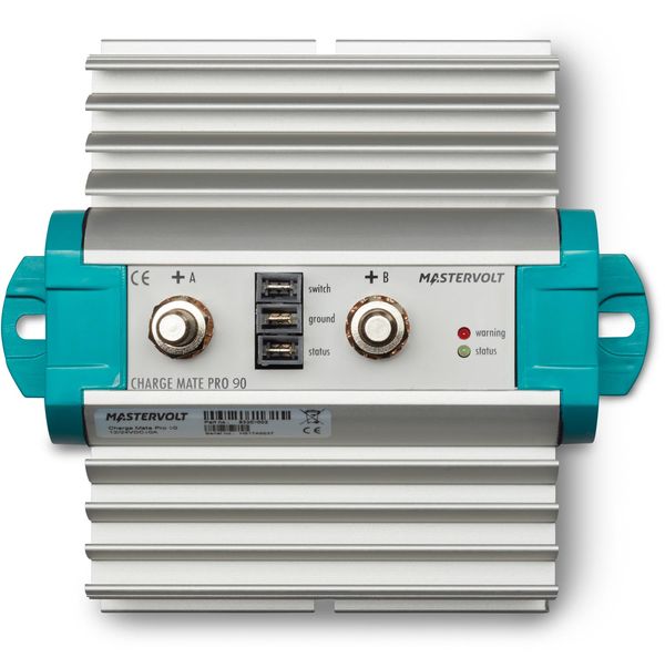 Mastervolt Charge Mate Pro 90 split charge relay 83309002 is a current limited electronic charge relay with high efficiency and reverse current protection. The Pro90 split charger is suitable for leisure and professional marine and mobile applications. It is an effective solution for high power demand on board and for the need of prioritised charging or current-limited charging. A secondary battery on board requires a dedicated charging solution. The Charge Mate Pro makes it possible to distribute the charger or alternator current effectively between two battery banks such as a starter and a service battery. The Mastervolt charging relay connects both batteries during charging and keeps them isolated when discharging, significantly reducing the risk of a flat starter battery. The Charge Mate Pro offers an additional advantage over mechanical charge relays, by limiting the charge current to the second battery. Like a starter battery, the primary battery will be charged with priority. The return current is automatically blocked even when the secondary battery has a higher voltage. An emergency start function is possible by connecting an optional bypass switch to the Charge Master Pro. A marine application example is the connection of a bow thruster battery to a service battery. The Charge Mate Pro ensures that the service battery is always charged with priority. The blocking of the return current from the bow thruster battery guarantees that the bow battery remains charged while the current limiting also prevents power dips of the onboard electrical network. The Charge Mate Pro 90 ensures a higher charge current for example when charging Lithium Ion batteries. It is also ideal for large automotive alternators up to 180A and can be used in parallel operation with a 225 Amp alternator to fulfil even higher continuous power demands of your onboard equipment. General specifications Monitoring: LED (warnings and status indication) Output current: limited to 90 A; > 25 C derating power Number of battery outlets: 2 Input voltage range: 9-32 V Parallel configuration: yes Battery voltage: automatic 12/24 V detection Remote switch functions: on, off, auto, start assist Dimensions, hxwxd: 157 x 140 x 80 mm (6.2 x 5.5 x 3.1 inch) Weight: 0.88 kg (1.9 lb) Compliance: CE Technical specifications Connection possibilities : 3 x faston connectors (switch, ground and status) o switch: for an optional single pole ON-OFF-ON switch for remote operation o status: for an optional LED indicator Power consumption: switch open: < 1 mA at 12/24 V DC Battery types: all types (Lithium Ion protection via Multipurpose Contact Output, product code 77030500) Switch on voltage: 13.5 V (12 V) / 27 V (24 V) Switch on delay : 5 sec Switch off voltage: 12.75 V (12 V) / 25.5 V (24 V) Switch off delay: 2.5 sec Relay: electronically (MOSFETs with low voltage drop of max 0.2 V) Temperature range (ambient temp.): -40 C to 60 C (-40 F to 140 F) Protection degree: IP65