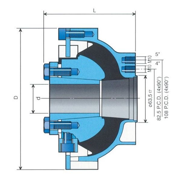 Eliminate shaft-transmitted noise and vibration Cushion torsional stress and shock loads Accommodate shaft misalignment and movements M SERIES Interrupts shaft-transmitted noise & vibration between engine/transmission & the boat's hull - no metal-to-metal contact. Angular misalignment capacity up to 2 &torsional flexibility up to 15. The large volume, highly elastic, encased element absorbs torsional shocks and stress without excessive deformation. Design allows the transfer of propeller thrust to the gearbox thrust bearing. Torque capacities 175Nm - 500Nm Suitable for 10HP to 100HP at 1500rpm