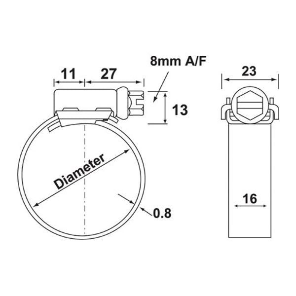Specifically designed for tough wire-reinforced hoses and where an extra margin of safety and reliability is required. Hi-Torque clamps out perform nut and bolt type clamps due to: Higher sealing pressure due to more uniform tightening Offer a larger adjustment for each size No loose parts so quicker to fit and requires less space Unique 'Straight Line' housing ensures that every thread in the screw is fully engaged in the band Twice the strength of ordinary worm drive hose clips due to the high tensile banding and hardened rolled thread screw Sold singly Lloyds Register Type Approval for marine, offshore and industrial use. They are specifically approved for the critical application of sealing wet diesel exhaust hoses. Material Specification All parts: BS304 - EN1 4301 Tensile strength = 1150 N/mm sq (approximately 75 tons/in sq) Recommended Setting Torques: 15 Nm (130 lb. in)