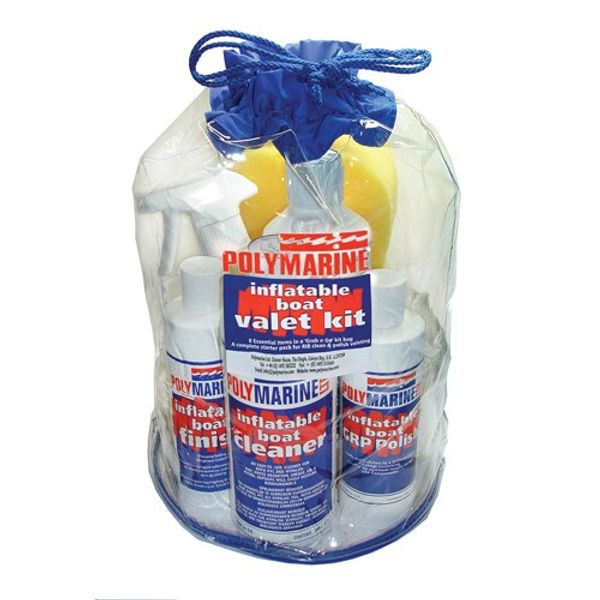 Supplied in a draw string PVC bag with blue fabric top, comes complete with two Inflatable Boat Cleaners, one Inflatable Boat Finish, one GRP Silicon Free Polish, two Polishing Cloths, one Sponge, one Trigger Spray and a pair of disposable gloves. Everything that you need to keep your Rib looking good.