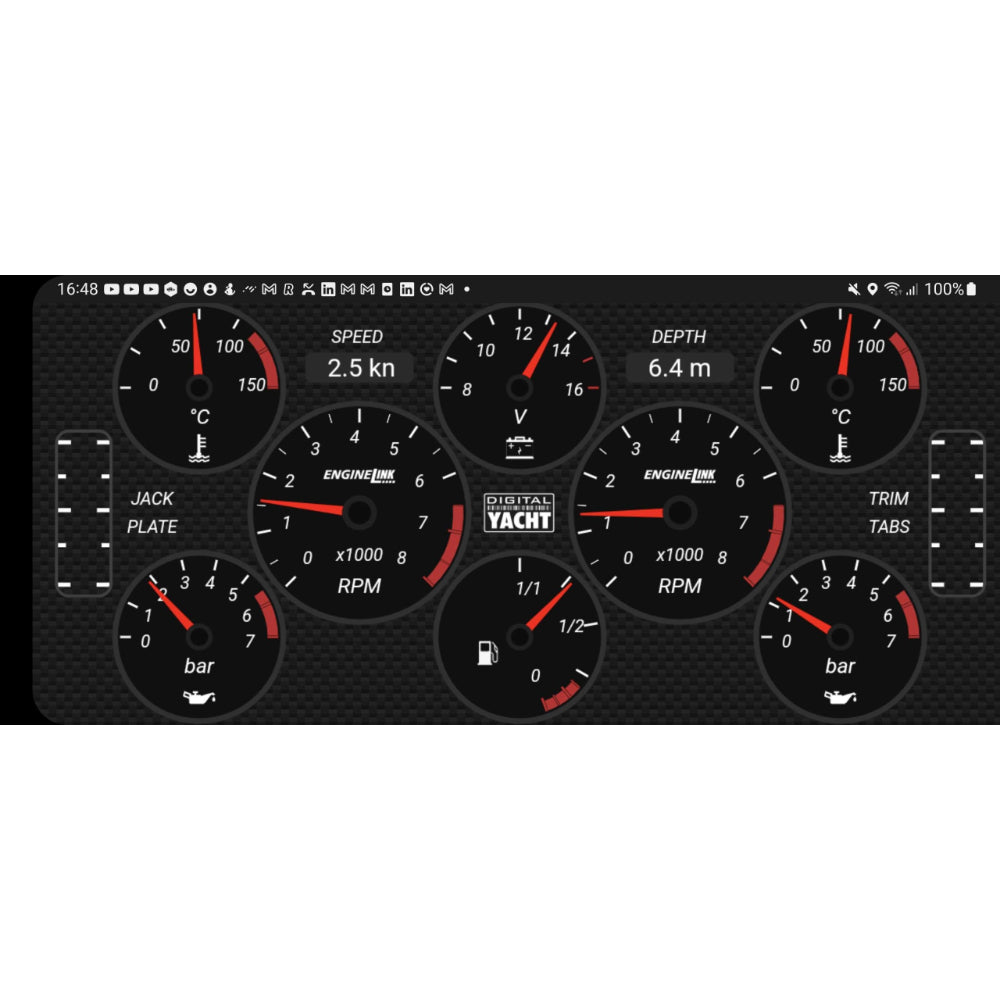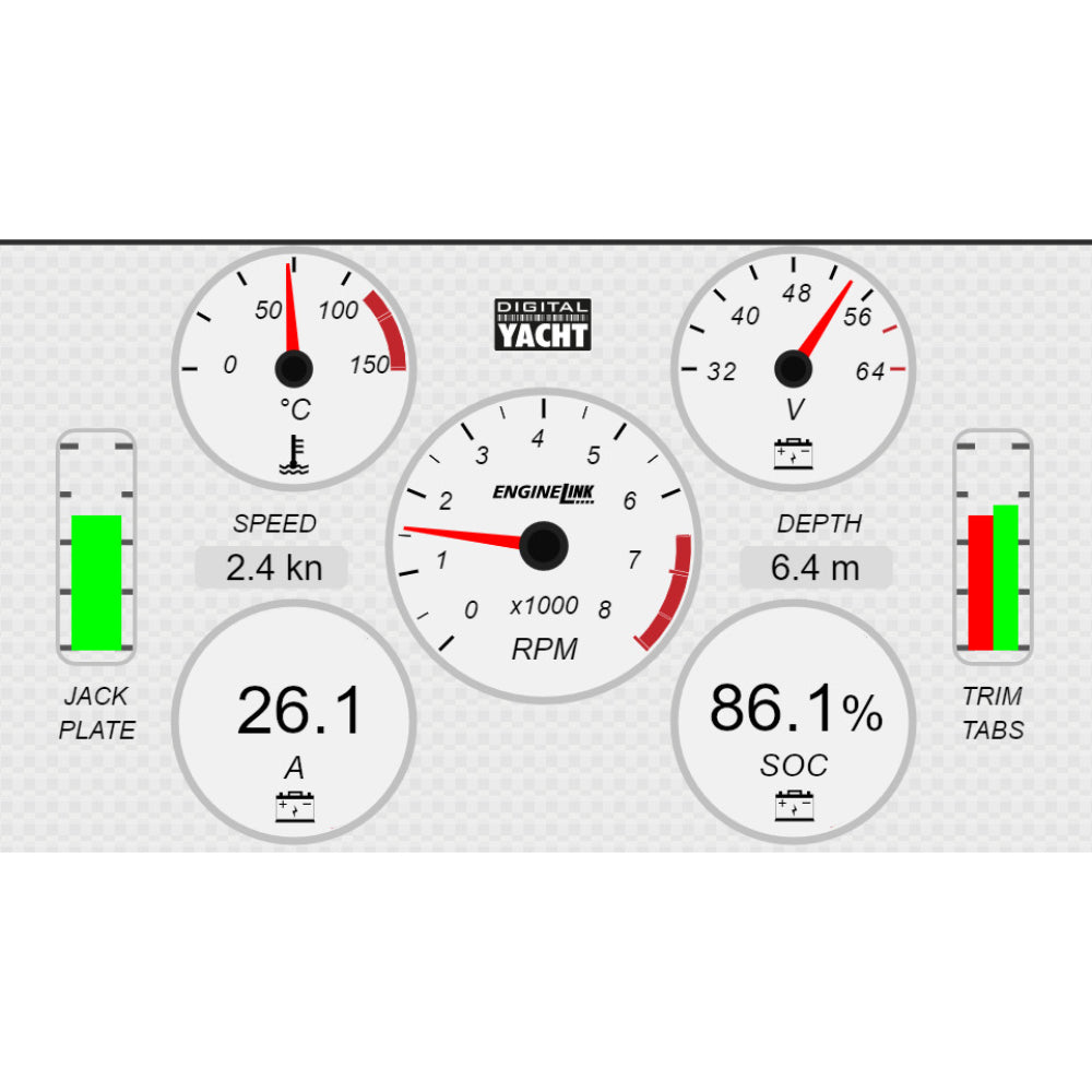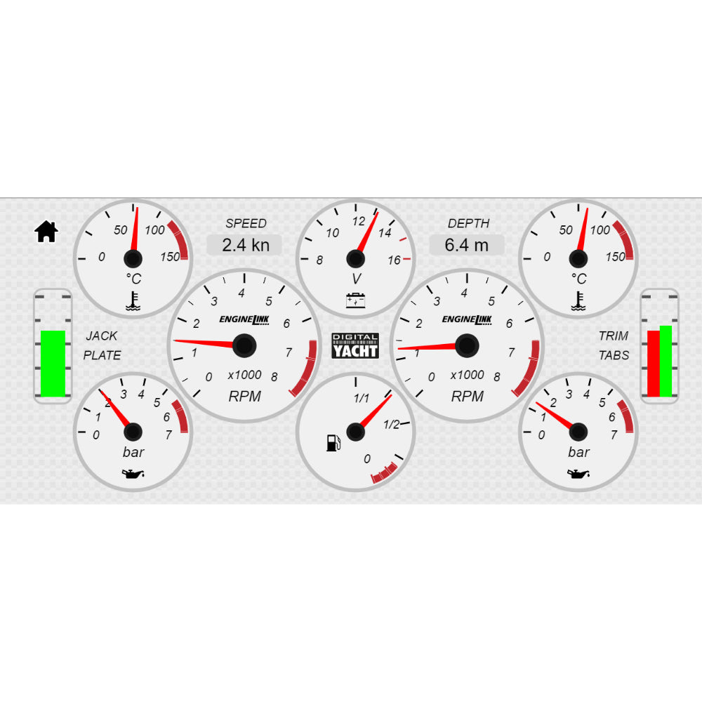 Either single or dual engine installations are currently supported and ENGINELink will work with any “NMEA 2000 ready” engine. If the vessel is fitted with NMEA 2000 compatible Trim Tabs or Jack Plates then the status of these performance critical accessories are also displayed on the dashboard.