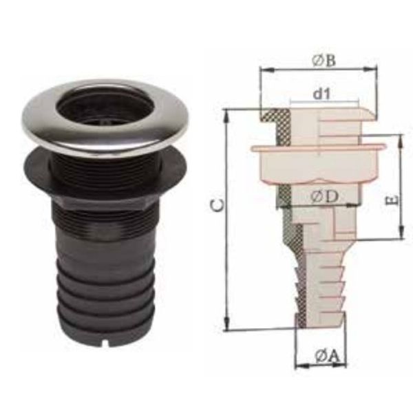 Available with either a straight or 90 degree hose connection, these plastic skin fittings offer easy thru hull installation for over board drainage, as well as having a stylish stainless steel finish to enhance your boat appearance.