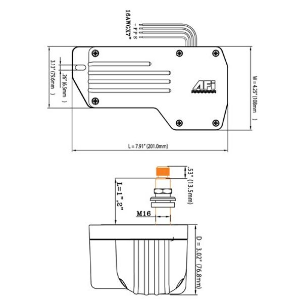 Fully sealed powder coated aluminium waterproof base and housing Powers a 26" (660mm) Deluxe arm and Deluxe blade combination or a 24" (609mm) Premier arm and Premier blade combination Shaft length: 2.5" (68mm), *includes 0.5" (13mm) length of knurled arm fitting Factory pre-set sweep angles of 80, with easy adjustment to 45 or 60 Chrome plated solid brass knurled drive nut with brass and stainless steel drive shaft Two speed motor Sealed 6" wire leads, 16 AWG Adjustable right or left self parking 0.625" (16mm) diameter shaft Coast to park RF shielded circuitry Includes 6 amp fuse and holder (operating switch not included) Measures approximately (L x W x D): 7.875" (200mm) x 4.25" (108mm) x 3" (76mm) - see drawing Stall torque: 139 in-lbs (160 kgf/cm; 15.7 Nm) Stall current: 9.0 - 10.5 amps No load current: 1.0 -1.6 amps