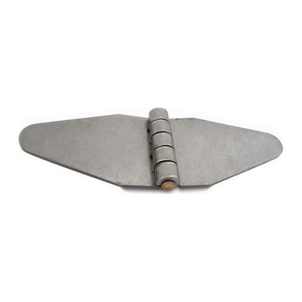 A backflap hinge made of mild steel with a bronze pin. This steel hinge measures 6" wide by 2" high.