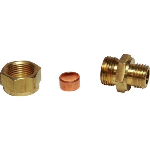 Union adaptor fitting used with CAV filters. The CAV fuel filter union adaptor features an M14 x 1.5 male thread to a 3/8" pipe compression connection.