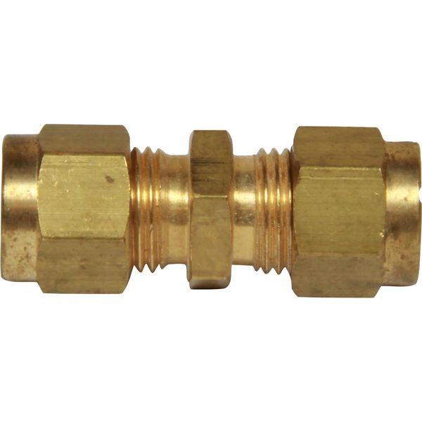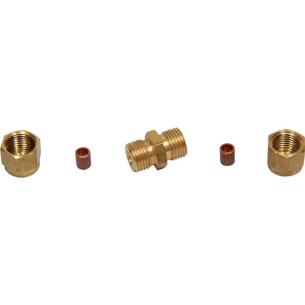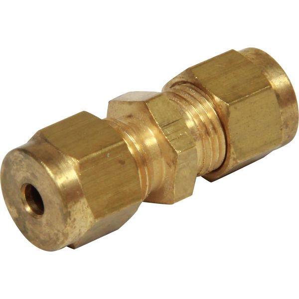 Compression pipe fitting to join together two compression tubes or pipes. This coupling features a 1/8" compression fitting each end and is supplied with copper compression olives and compression nuts.