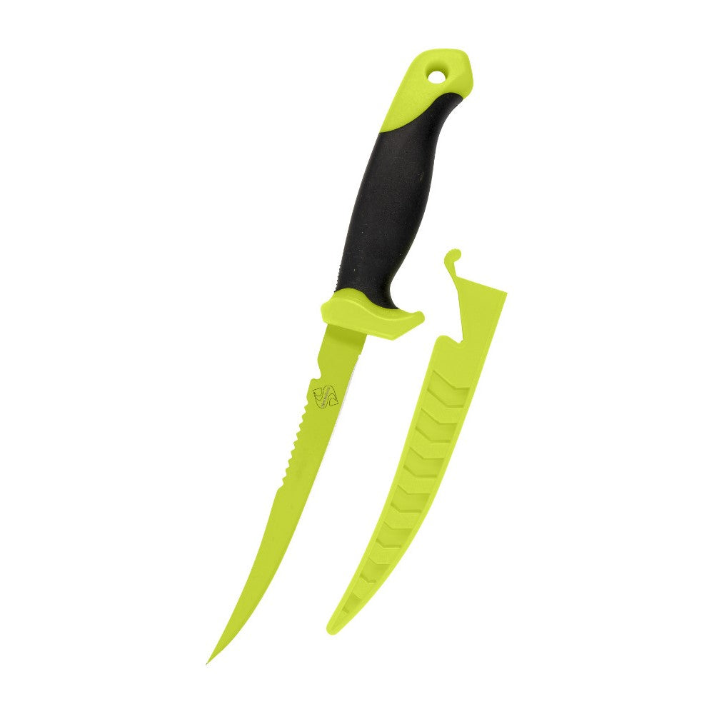 An innovative filleting knife with a quality 4116 grade German stainless steel blade treated with hard Chartreuse surface coating. On the back of the blade is a fish scaler plus a safety blade. The PP plastic sheath has a knife handle lock for safety and an ingenious cut-out allowing you to cut braid or mono using the rear safety blade without removing the sheath. A rugged PP plastic handle with TPR Rubber section for extra grip even when wet.