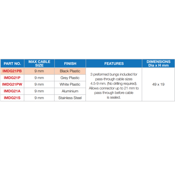 Preformed bungs included for pass-through suitable for cable sizes 4.5-9mm. Description The DG21 cable gland is designed as an attractive low profile shape, which is available in various finishes. The entire DG series of glands are tested achieving the IP68 rating which ensures a perfect waterproof solution for various cable management applications. Each unit is supplied with clear fitting instructions and A4 stainless steel fixings. The tapered seal ensures that the hole closes completely, creating a watertight seal around the cable. Ideal for electrical cabling applications and ducting through bulkheads, decks, and panels – i.e. VHF, Satnav, GPS and Radar installations. Dimensions: 49 X 19mm Max Cable Size: 9mm Finish: stainless steel