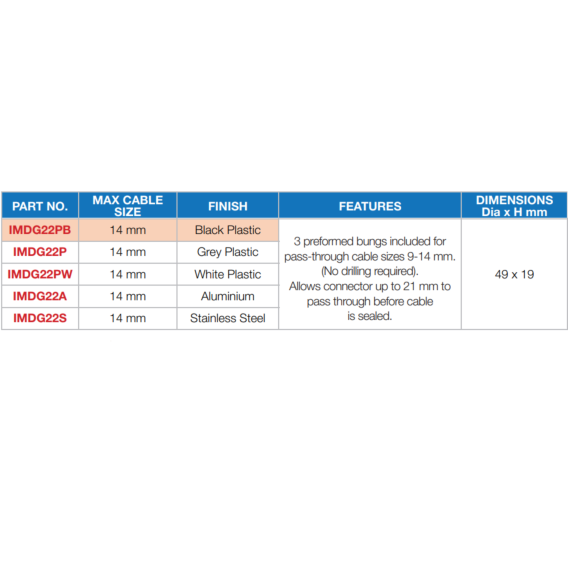 Preformed bungs included for pass-through suitable for cable sizes 9-14mm. Description The DG22 cable gland is designed as an attractive low profile shape, which is available in various finishes. The entire DG series of glands are tested achieving the IP68 rating which ensures a perfect waterproof solution for various cable management applications. Each unit is supplied with clear fitting instructions and A4 stainless steel fixings. The tapered seal ensures that the hole closes completely, creating a watertight seal around the cable. Ideal for electrical cabling applications and ducting through bulkheads, decks, and panels – i.e. VHF, Satnav, GPS and Radar installations. Dimensions: 49 X 19mm Max Cable Size: 14mm Finish: white plastic