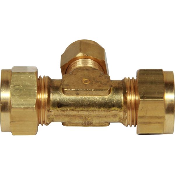 The AG compression T piece is constructed from brass in a T-shaped configuration (also known as a tee piece). This unequal T piece has one 5/16" and two 3/8" compression connections.