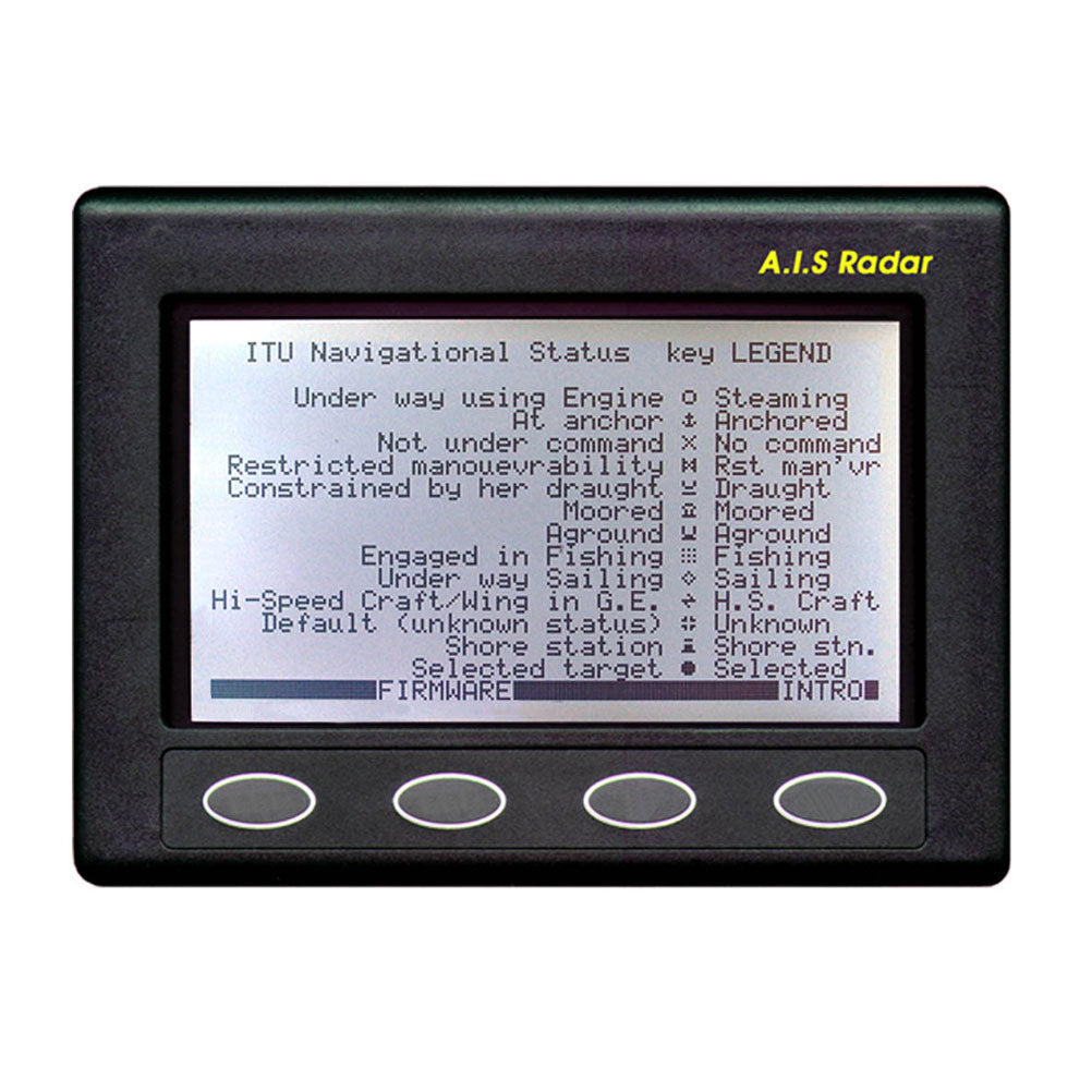 The display with ranges of 0.125 0.25 0.5 1 2 4 8 16 and 32 nautical miles shows AIS carrying vessels and SART transponders in a format normally associated with conventional radar. A trail of previous positions clearly chows the relative track of all the targets on the screen. A box to the right of the screen displays the speed over the ground the vessel name mmsi number and the latitude and longitude of any target selected by the user. As each vessel leaves a trail of previous positions the user can instantly see its relative position and bearing. Should any vessel cause concern (particularly if there is a risk of collision) it can be selected and its AIS data displayed. The MMSI number is immediately available so in the last resort a DSC call can be made directly to that vessel. If the user selects his own vessel then the screen repeats the users GPS position course and speed over ground. Each vessel’s status is shown by a different symbol so the user can see if a vessel is underway at anchor fishing etc. The compact unit has a white backlit LCD display operates from 12 volts and consumes little power.
