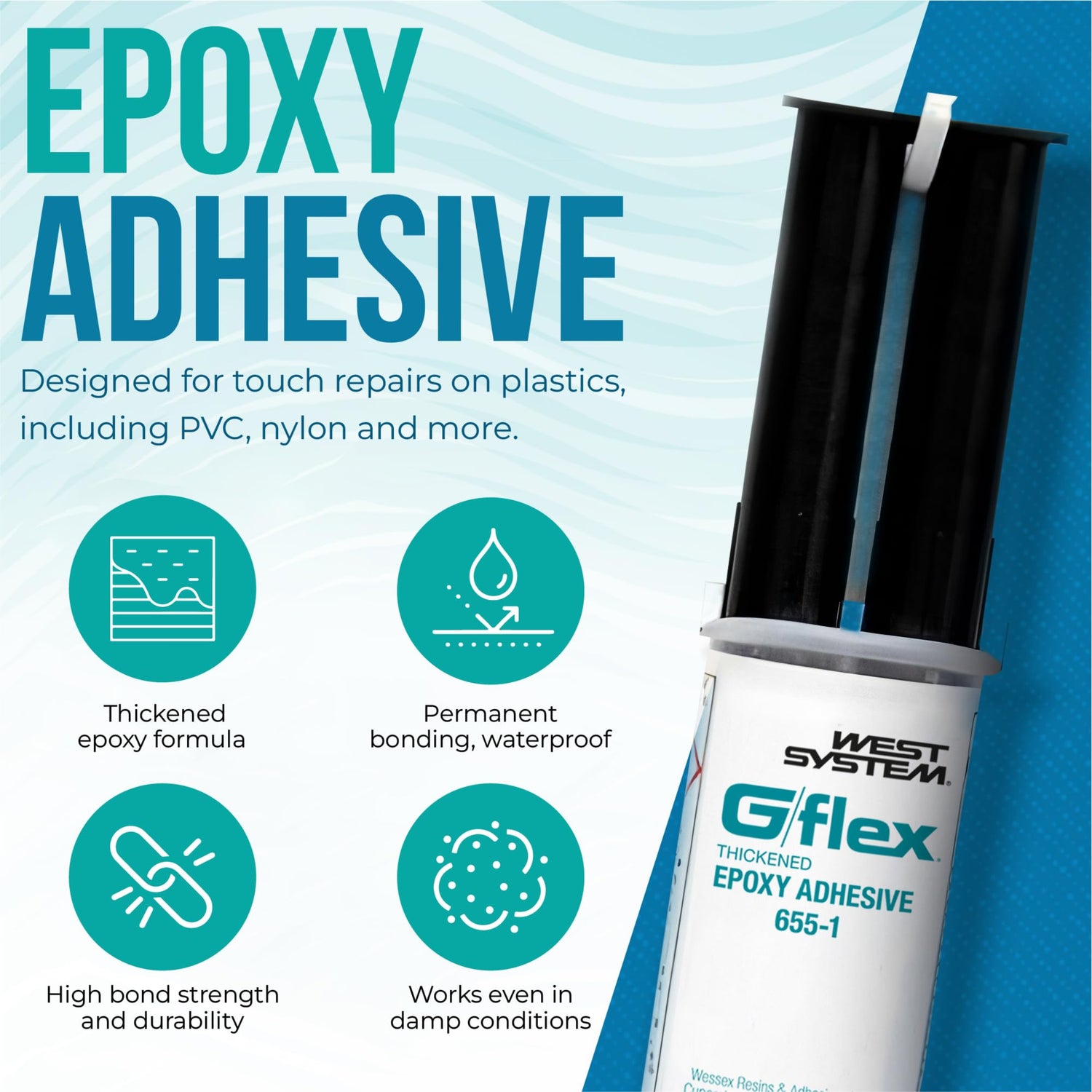 West System G/flex 655-1 is a versatile thickened epoxy adhesive in a convenient dispensing syringe. The epoxy has great adhesion on plastics including HDPE, LDPE, ABS, PVC, Polycarbonate and Hypalon. The easy-to-use syringe dispenses small quantities of epoxy right where you need it. The viscosity of the adhesive is similar to gel toothpaste so it won’t run or sag.