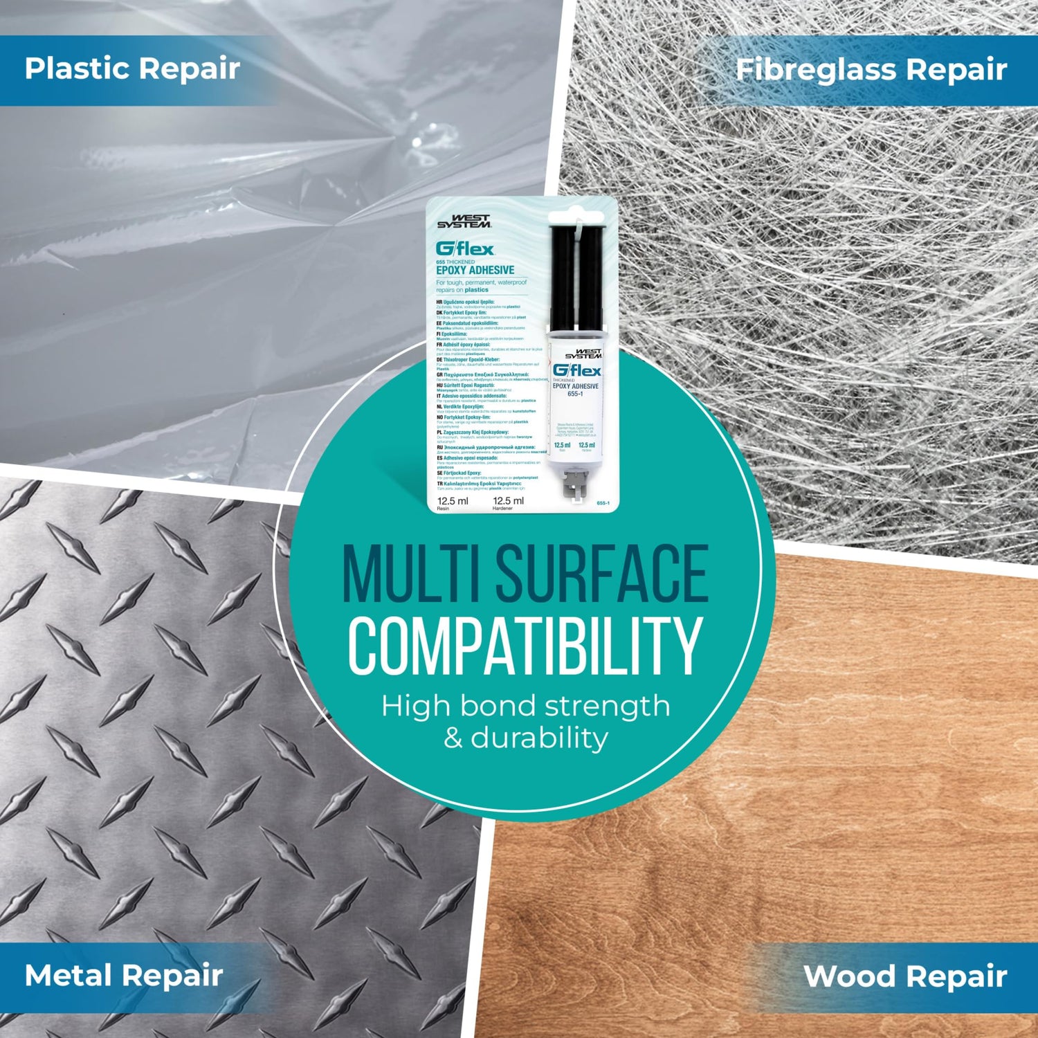 G/flex 655 is a toughened epoxy that makes permanent, waterproof structural bonds. It absorbs the stresses of expansion, contraction, shock, and vibration. This adhesive also bonds metal, glass, masonry, fiberglass and wood. The G/flex 655-1 syringe contains 0.42 oz of resin and 0.42 oz of hardener, ideal for small repair jobs.