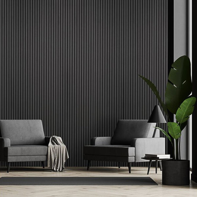 Stylish wooden wall panel offering a modern slatted look, combining style with functionality. Finished in a luxurious charcoal oak real wood veneer, the panel is easy to install and provides a sleek, contemporary aesthetic that complements any indoor space. Each panel measures 2.4 meters in height and 0.6 meters in width, providing a coverage of 1.44 square meters. The slats are crafted from MDF with a real wood veneer, measuring 35mm x 12mm, and are mounted on a flexible 9mm black felt backing. The panel is suitable for oiling or lacquering to maintain its finish, ensuring long-lasting durability.