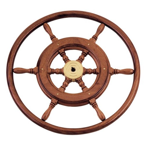 6 spoke traditional wooden steering wheel made from mahogany spokes & wheel, brass trim and brass centre cap. This wheel measures 600mm (23.6") in diameter and are designed to fit 11/16" to 3/4" taper helms.