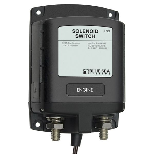500 Ampere Bi-Stable Magnetic Latching Solenoid allows high-amp switching under load where manual control is not required. 500 Ampere continuous rating Bi-Stable Magnetic Latch (ML) - draws no current in the ON or OFF state 3/ 8"-16 tin-plated copper studs for maximum conductivity and corrosion resistance 7/ 8" (22mm) stud length accepts multiple cable terminals Label recesses for circuit identification Silver alloy contacts provide high reliability for switching live loads Retail packaging includes Remote Control Contura Switch
