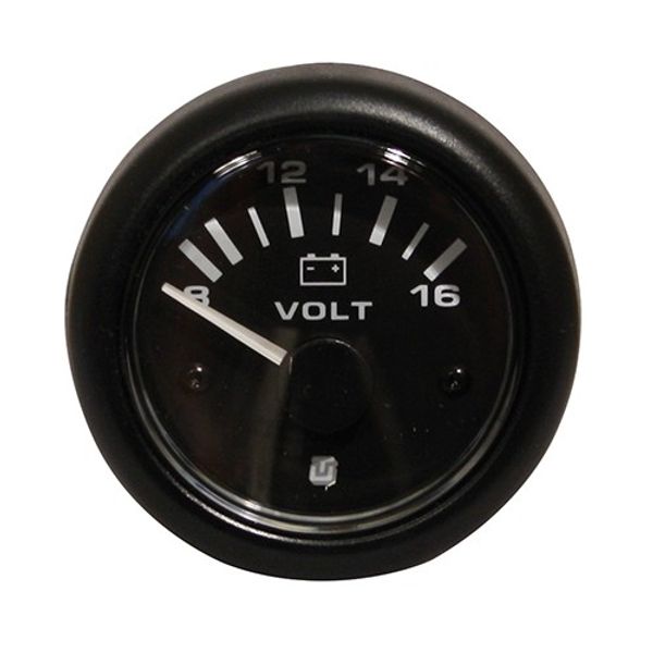 Black voltmeter for all 12 volt electrical systems, with white graphics and black bezel, metric American scale with dial range: 8-16 volts, with hole size 52mm (2.04"). Measuring the potential difference, or voltage, between two points in an electrical or electronic circuit, for marine it measures the battery voltage and the general condition of the battery charging system.