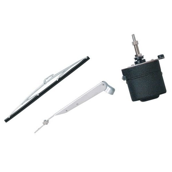 Windshield Mount 3/8" (9mm) diameter KIT CONTENTS: STD Wiper Motor 11.5" (292mm) Deluxe stainless steel curved blade (6-11311) Deluxe adjustable 6.75" to 10.5" (171 266mm) stainless steel arm (6-11340) Sweep: 80? Shaft Length: 2.5" (63mm) STD Wiper Motor Features: Corrosion-proof aluminium alloy case with black crackle finish Base & mounting plates are chrome plated naval brass Maximum current draw: 2 amps 80 sweep, adjustable right or left self-parking Shaft diameter: 3/8" (9mm) Dimensions(L x W x D): 3.875" (98mm) x 2.25" (57mm) x 3.5" (89mm)