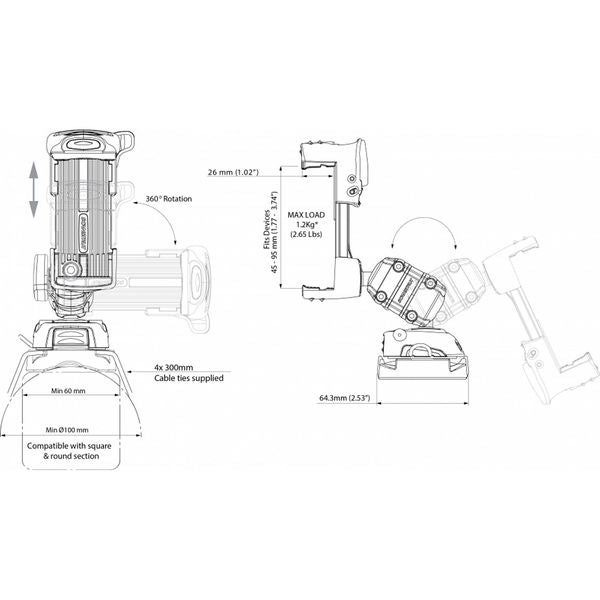 The Scanstrut ROKK mini is an adjustable mounting clamp designed for even the toughest on board applications. The RLS-509-403 is a universal phone clamp suitable for all devices between 45mm and 95mm (1.7" - 3.7"), up to 1.2Kg in weight. It features a cable tie mount base which will mount onto over-sized rails and other tubes & sections 60mm (2.3") to 100mm (3.9") in diameter, creating the toughest onboard mounting system for your phone. It is tough and reliable, featuring a metal on metal locking system to completely secure your gadgets. The base features a quick release button to install and release your devices instantly, while adjustment is easily performed with one turn of the hand. This Phone Mount Kit fits devices between 45mm and 95mm including the following: - iPhone 4, 4s, 5, 5s, 6, 6s, 6+, 7, 7+, 8, 8+ & X - Samsung Galaxy 3, 4, Note & S8 - Google Pixel XL, 2, 2 XL - HTC 1, U11, U12+ If your phone isn't listed please check the dimensions of your device. Please Note: mobile phone is NOT included.