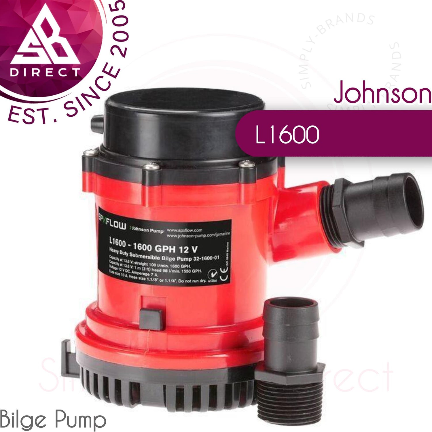L1600 SUBMERSIBLE BILGE PUMP 12/24 V DC The best choice when you are looking for a high performance, heavy duty bilge pump that is designed to meet & exceed the tough demands of commercial & recreational duty. This pump has a liquid cooled, 12-pole motor with double ball bearings for extended service life. The L2200 motor is sealed off by a mechanical seal that eliminates shaft wear & allows for service & replacement, while the L1600 has a lip seal. The L4000 high capacity, heavy duty bilge pump has been developed by Johnson Pump as the premier pump in our submersible bilge pump range. Featuring a robust motor design, mechanical shaft seal, high impact ABS plastic and unique threaded port design, the L4000 will out perform all other comparable pumps on the market. Universal base plate and a choice of 1.1/2" or 2" ports makes for a simple installation. All pumps include a removable check valve. Specifications: Model: L1600 Shaft: SS2343 Wire Size: 1.5mm? Max Diameter: 108mm Max Height: 149mm Weight: 1.3kg