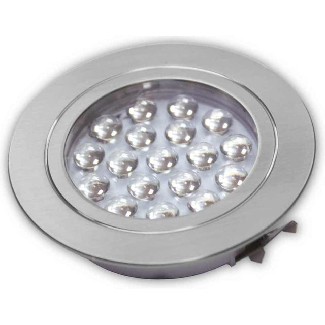 A 12V dimmable downlight with a brushed aluminium finish bezel and built in LEDs providing a Warm White 3000K light for just 1.67W of power. This waterproof downlight is designed for recess mounting and is ideal for use within cupboards, wardrobes and motorhome garage areas. The light is 68mm in diameter and fits a cut out of 52mm. - Voltage: 12V - Wattage: 1.67W - Protection rating: IP44 - Colour temperature: Warm White (3000K) - Lumens: 121 - Switched: No - Touch operation: No - Dimmable: Yes