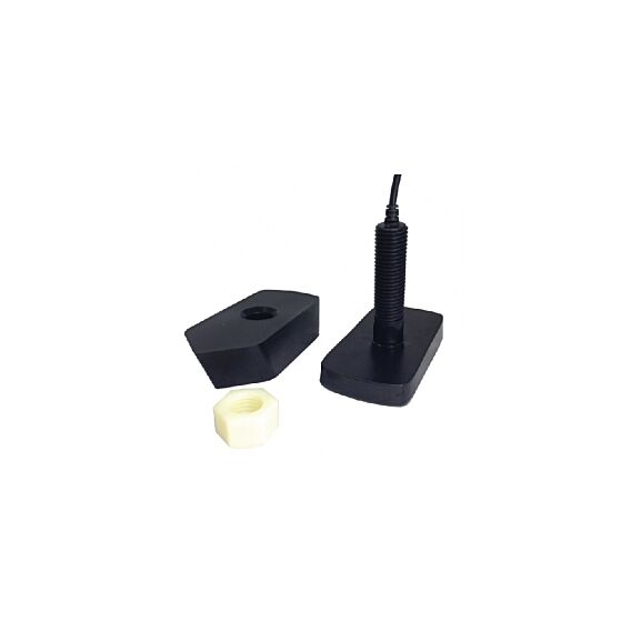 Dual Beam, 20/74 degrees. 200/50kHz, temp included. 6.7"L x 3"W x 1.4"D (below boat hull). Shaft: 1" diameter. Cable Length: 30 Feet.