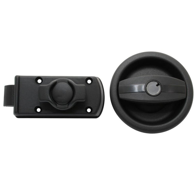 Very popular lock system in the market-place. Both circular handle and bolt mechanism are supplied as a kit. Twist handle is no longer supplied with barrel and 2 keys. Black, left hand. If barrel and keys is required then please order 1 x 72289 additionally.